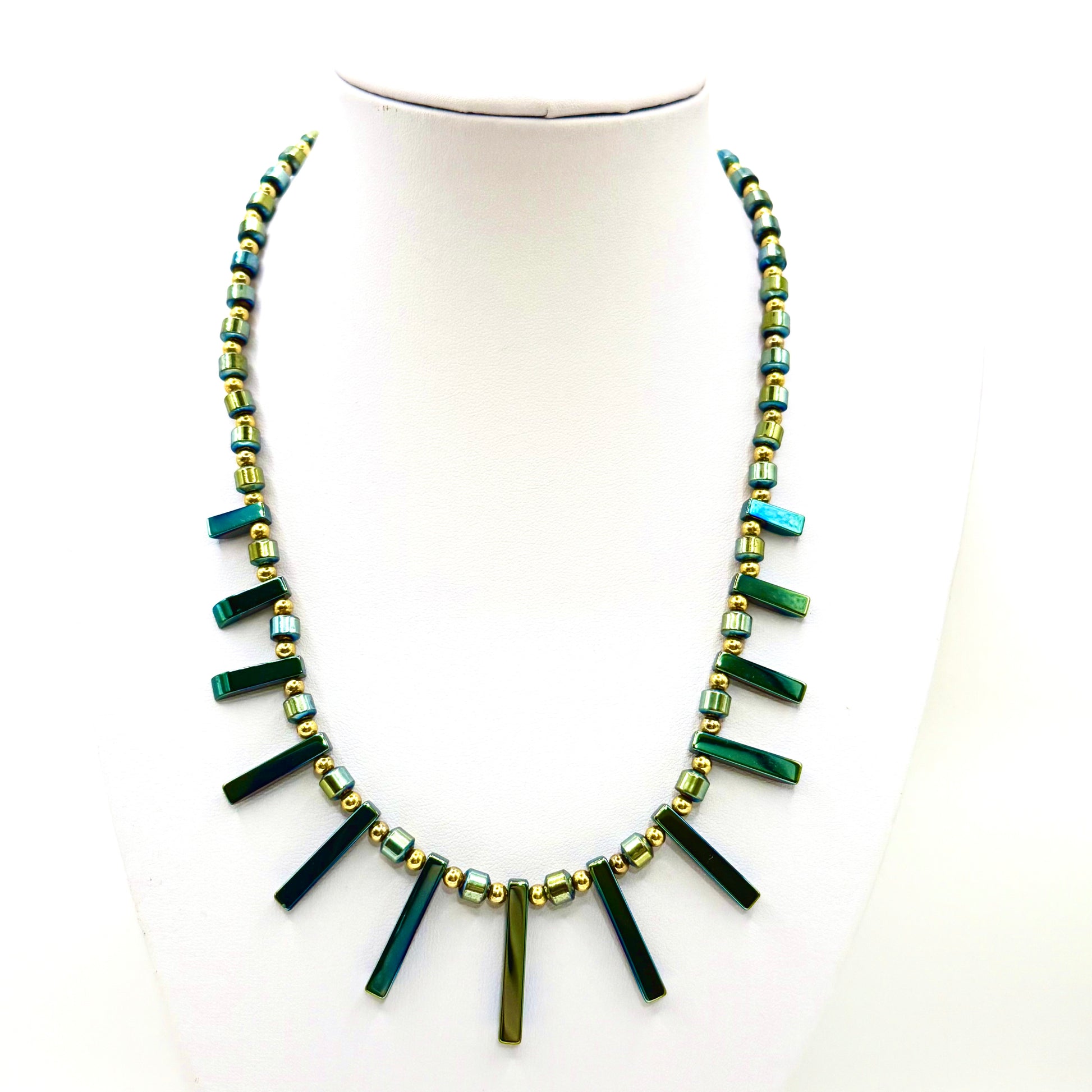 Handmade by Ruth - Hematite Bead Necklace: Hues of Greens & Golds. Necklace is 19 inches long. Beautiful iridescent quality with beads reflecting in the light and showing different colours. It will come in a handmade gift box.