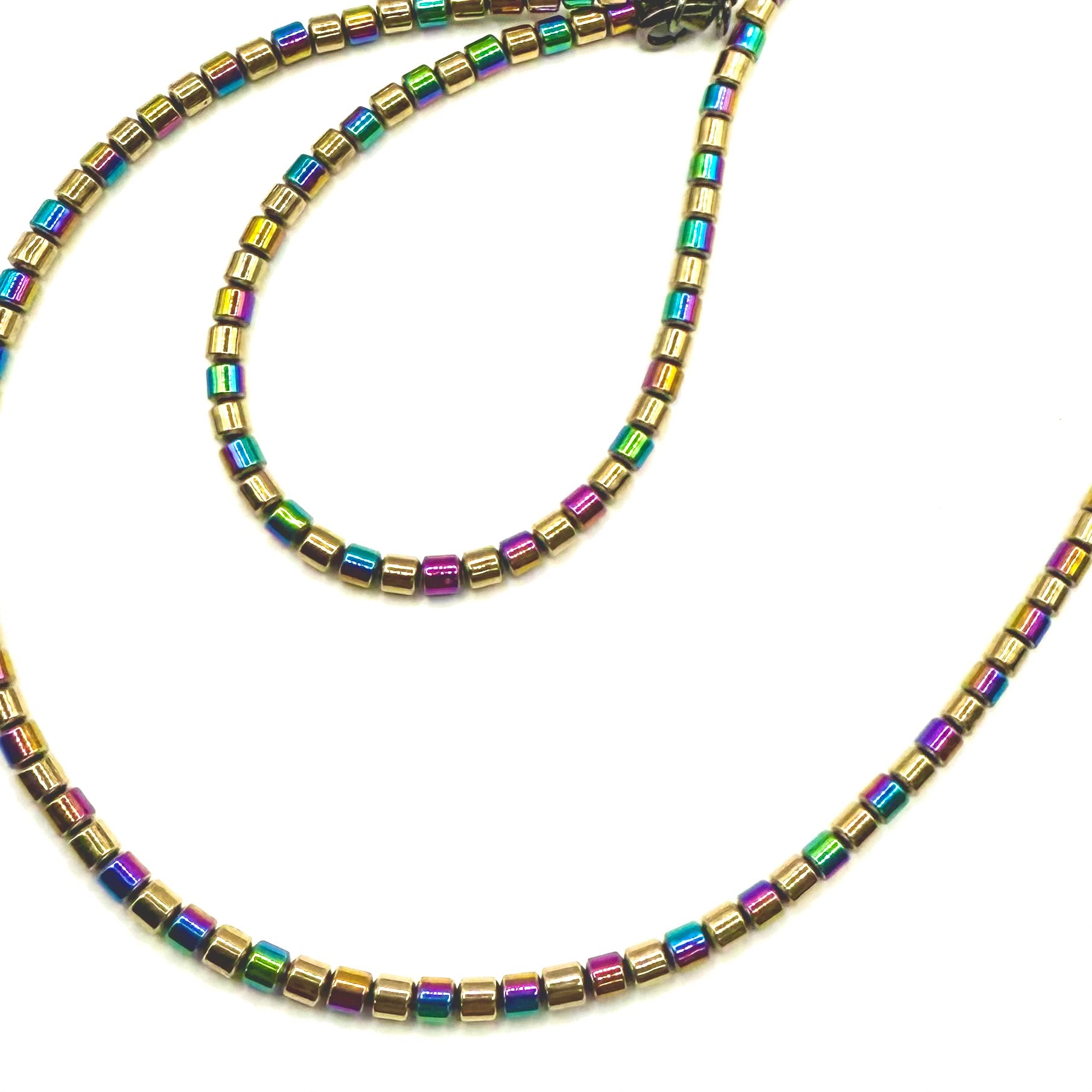 Handmade by Ruth - Hematite Bead Necklace: Hues of Greens Golds, & Pinks. Necklace is 22 inches long. Beautiful iridescent quality with beads reflecting in the light and showing different colours. It will come in a handmade gift box.