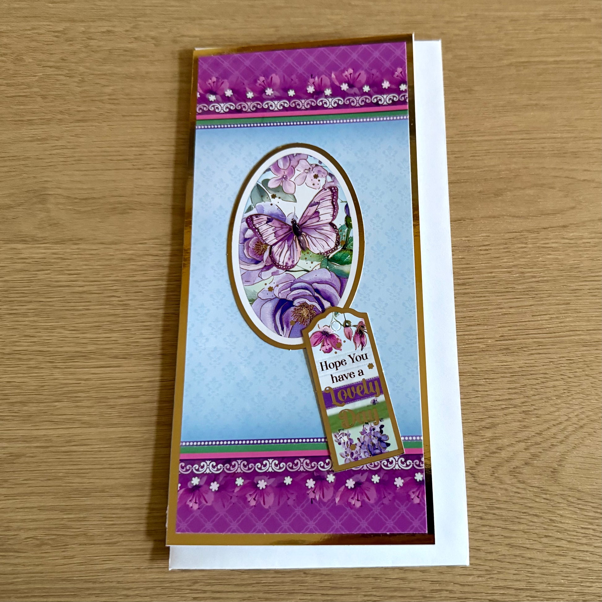 Three handmade cards - size DL 8”x4” - with envelopes showing butterflies and flowers with deep pink and pale blue hues. Please check out the pictures. Handmade by Ruth. These cards only post to the UK.